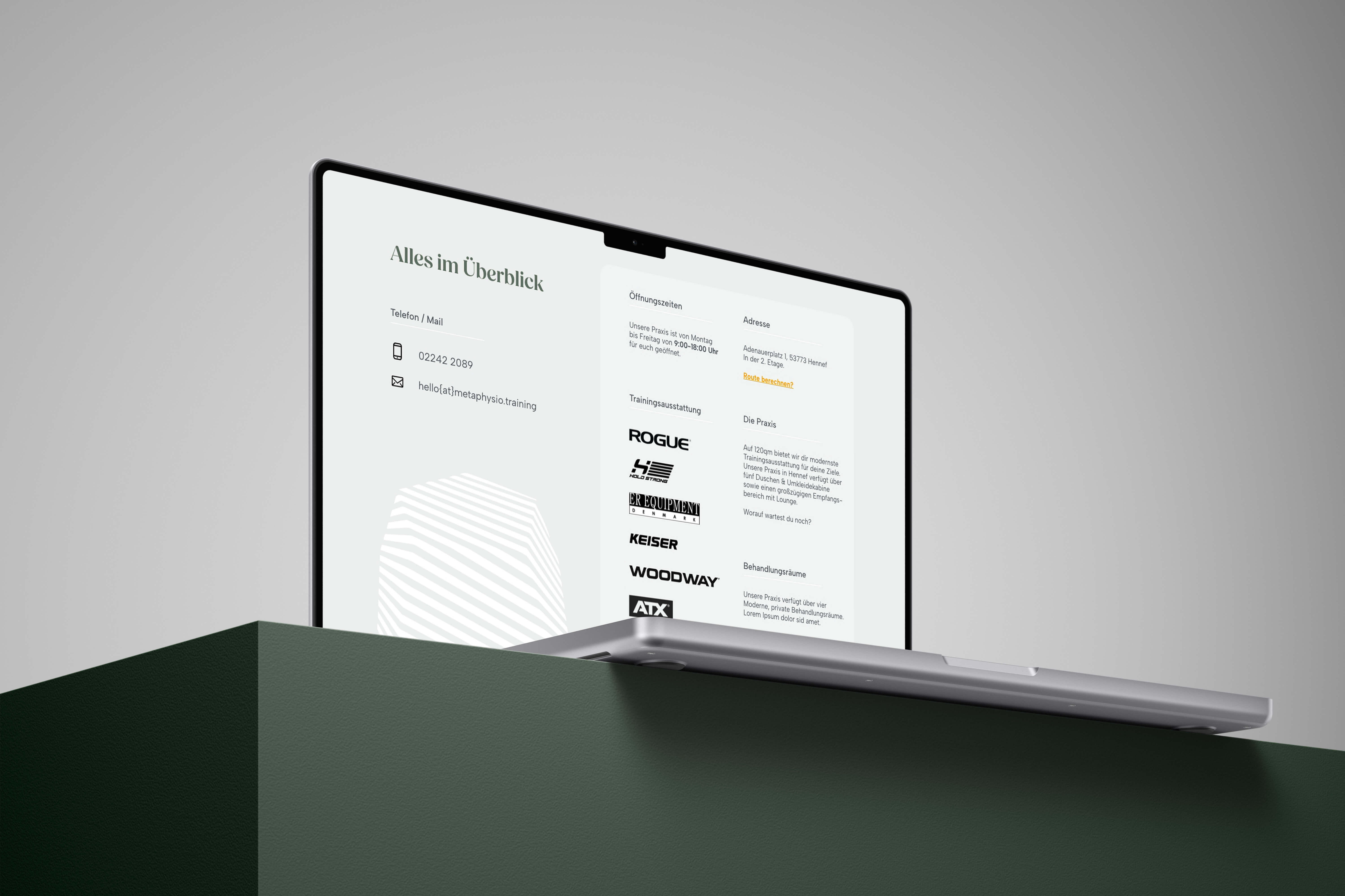 Mit einer beruhigenden Farbpalette aus sanftem Grün und Creme vermittelt das neue Branding Vertrauen und Seriosität. Die visuelle Gestaltung unterstreicht die Kernwerte von Metaphysio: ein ganzheitlicher Ansatz, der Körper und Geist verbindet. Durch authentische Geschichten, die echte Veränderungen aufzeigen, und durchdachte Designelemente, die die Philosophie greifbar machen, stärkt Metaphysio die emotionale Bindung zu seinen Patienten. Ein einheitlicher Auftritt, der auf allen Kanälen – von der Website bis zur Praxisgestaltung – präsent ist, schafft ein Markenbild, das sowohl professionell als auch inspirierend wirkt.
